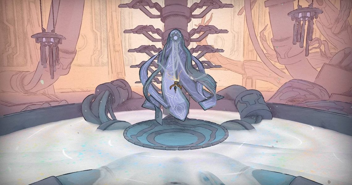 From the first overseer waypoint, climb up, and you should see Shii lying weakly underneath a spine contraption. Upon walking across him, Shii will mention how curious it is that there’s a working robot. However, it’s not until Mio goes past Shii a few times that she can start offering him Nacre.